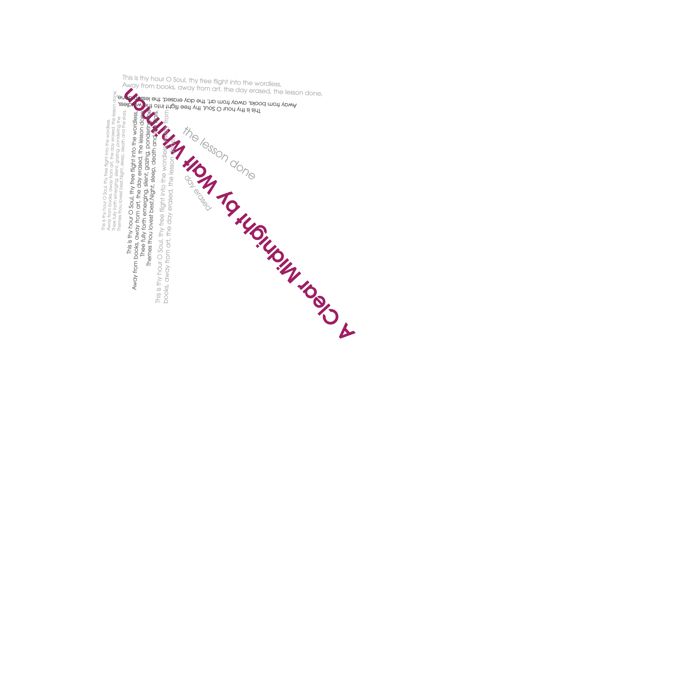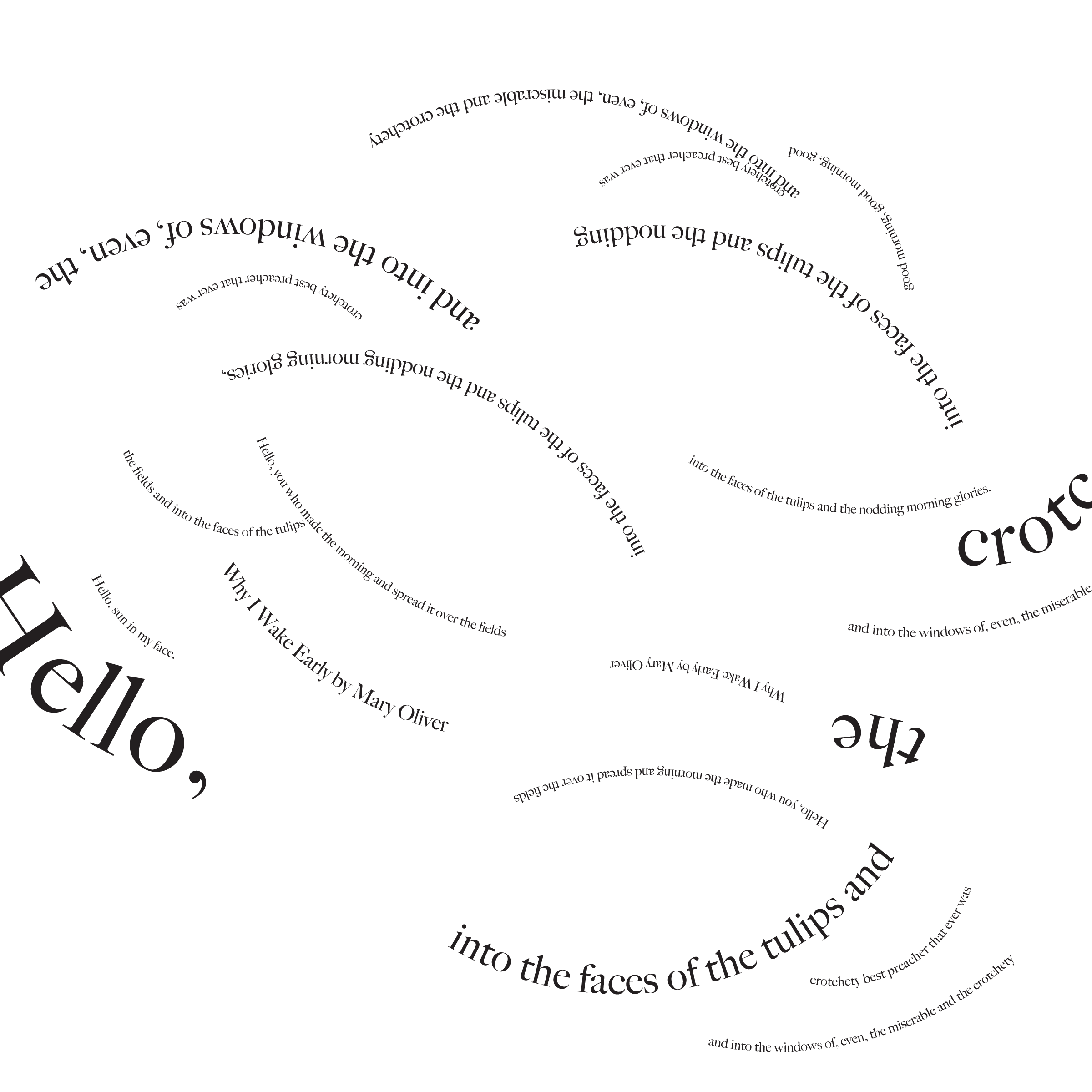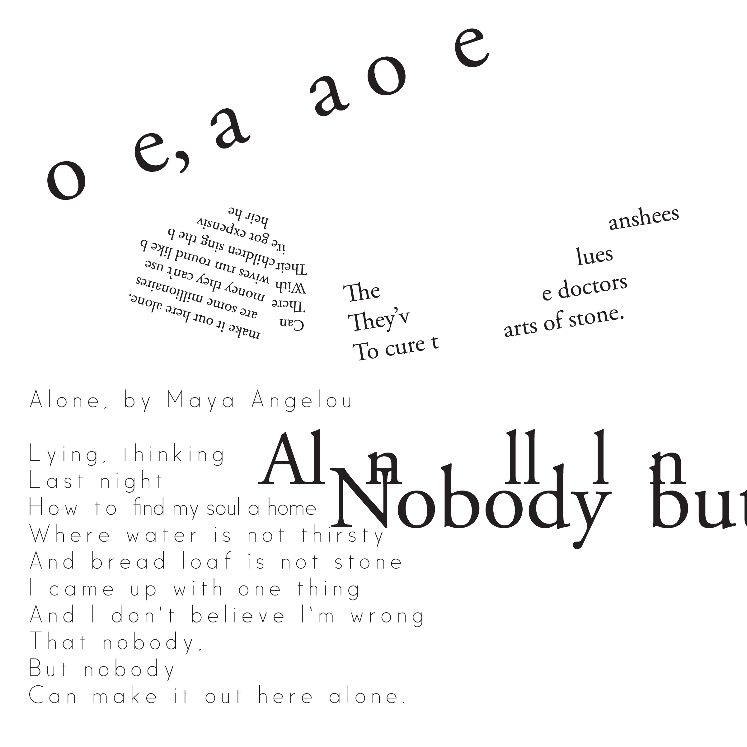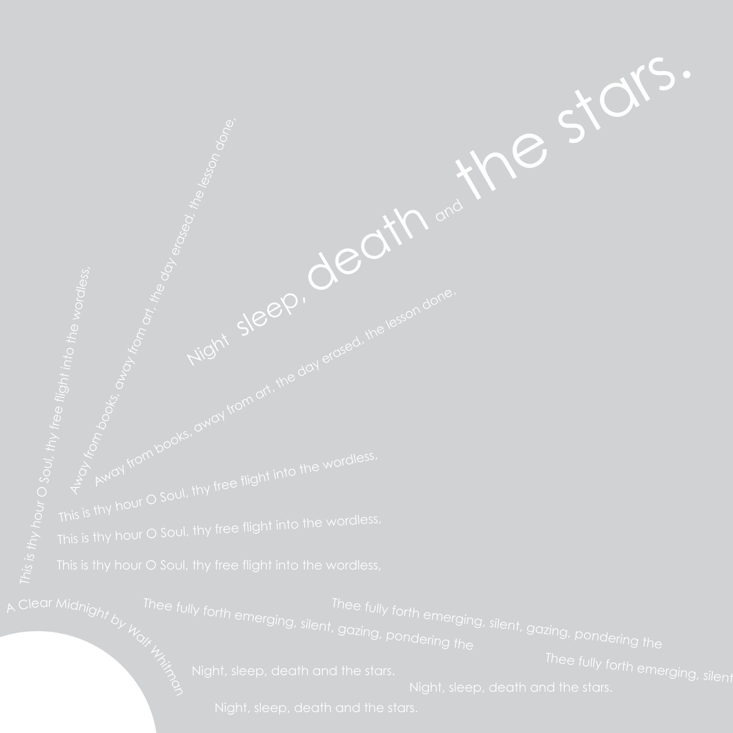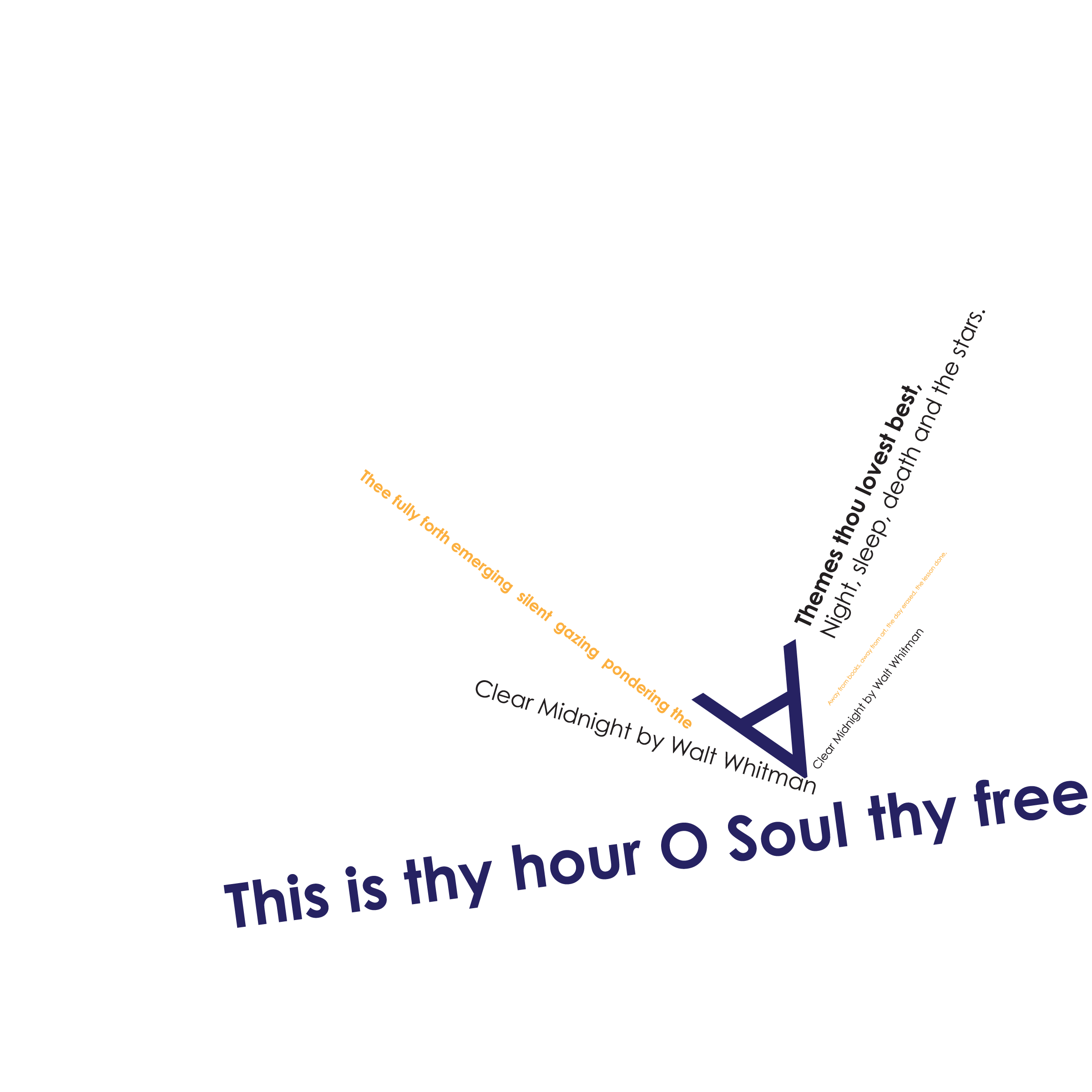 Throughout my courses studying Typography and Advanced Typography, I learned of six different approaches to type. They included: axial, transitional, random, dilatation, and radial layouts. I then went on to use American Poetry excerpts to explore the many potential outcomes that these systems can produce.